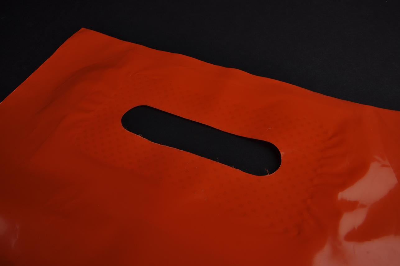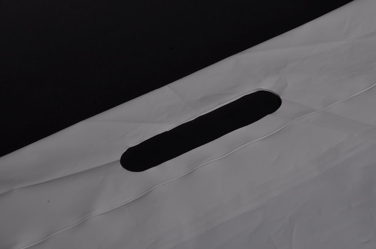 En plastkasse med dubbelt lager plast i överkant, vid handtaget. Denna påse används ofta till att lägga större saker i, t.ex. vid försäljning av jackor m.m.